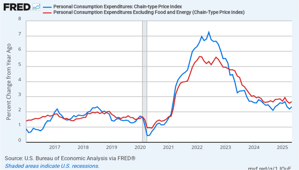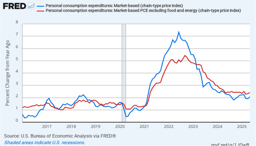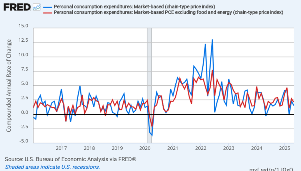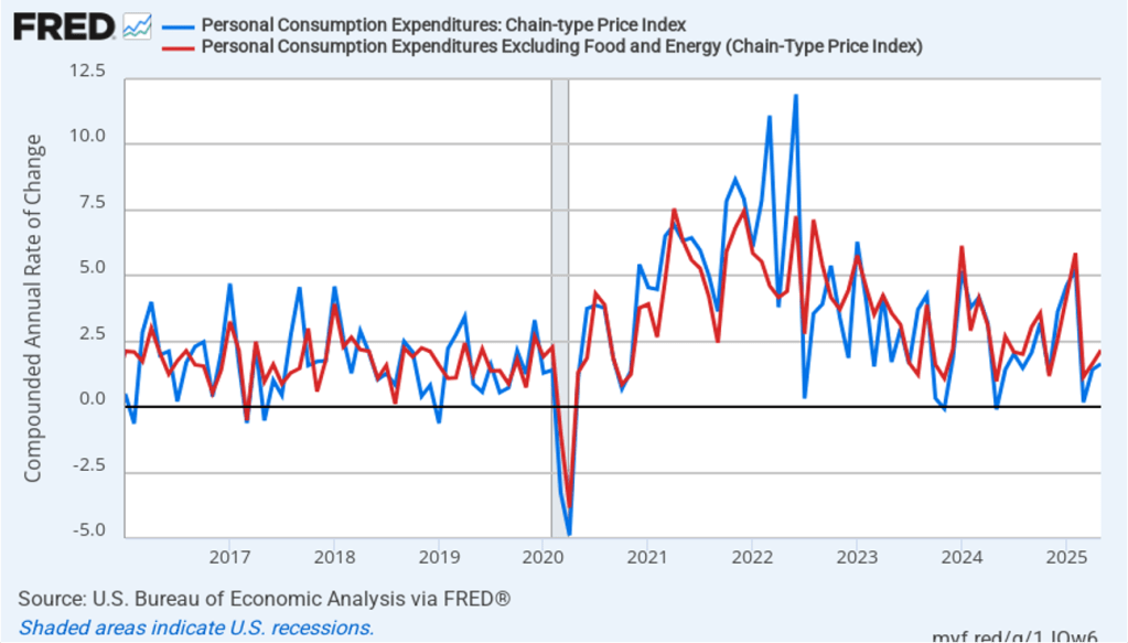 The following figure shows PCE inflation and core PCE inflation calculated by compounding the current month’s rate over an entire year. (The figure above shows what is sometimes called 12-month inflation, while this figure shows 1-month inflation.) Measured this way, PCE inflation increased in from 1.4 percent in April to 1.6 percent in May. Core PCE inflation also increased from 1.6 percent in April to 2.2 percent in May. So, both 1-month PCE inflation estimates are close to the Fed’s 2 percent target. The usual caution applies that 1-month inflation figures are volatile (as can be seen in the figure), so we shouldn’t attempt to draw wider conclusions from one month’s data. In addition, these data likely don’t capture fully the higher prices likely to result from the tariff increases the Trump administration announced on April 2.