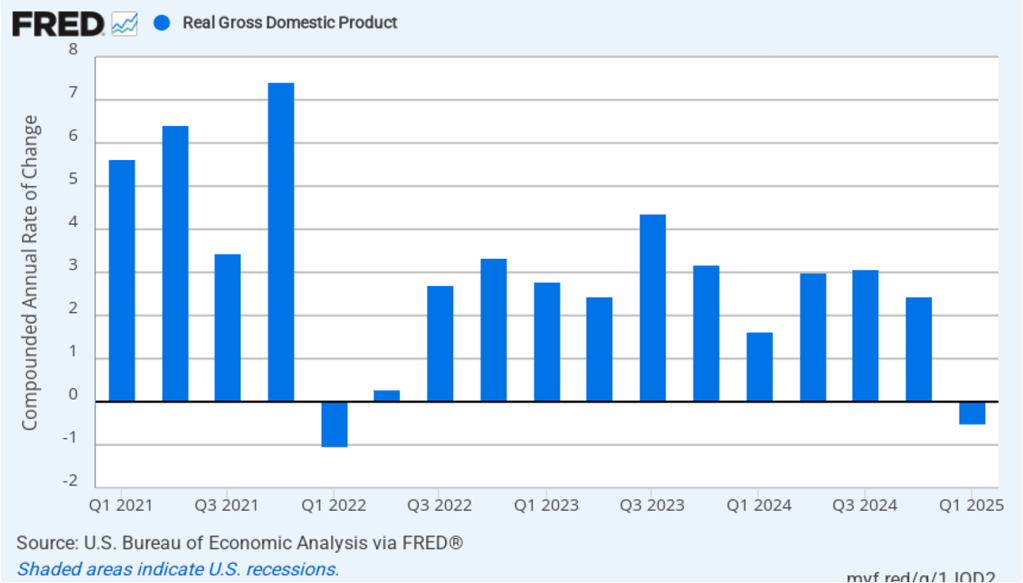 Earlier this week, the BEA released a revised estimate of real GDP growth during the first quarter of 2025—January through March. The BEA’s advance estimate, released on April 30, was that real GDP fell by 0.3 percent in the first quarter, measured at an annual rate. (We discussed the BEA’s advance estimate in this blog post.) The BEA’s revised estimate is that real GDP fell by 0.5 percent in the first quarter. The following figure shows the current estimated rates of real GDP growth in each quarter beginning in 2021.