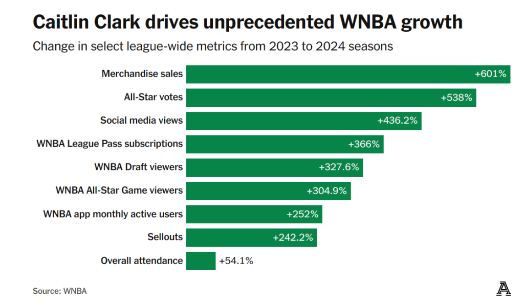 Caitlin Clark’s ability to hit three-point shots made her a star at the University of Iowa. Since she joined the Indiana Fever of the Women’s National Basketball Association (WNBA) in 2024, she’s been, arguably, the league’s biggest star. An article on theathletic.com discussing Clark’s effect on the league includes the following chart: