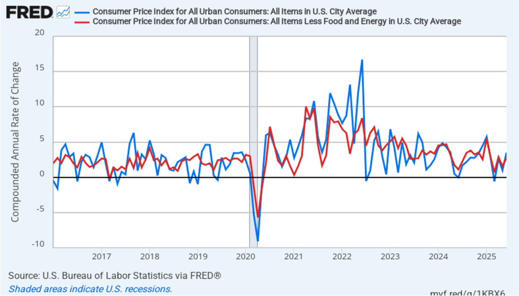 Today (July 15), the Bureau of Labor Statistics (BLS) released its report on the consumer price index (CPI) for June. The following figure compares headline CPI inflation (the blue line) and core CPI inflation (the red line).