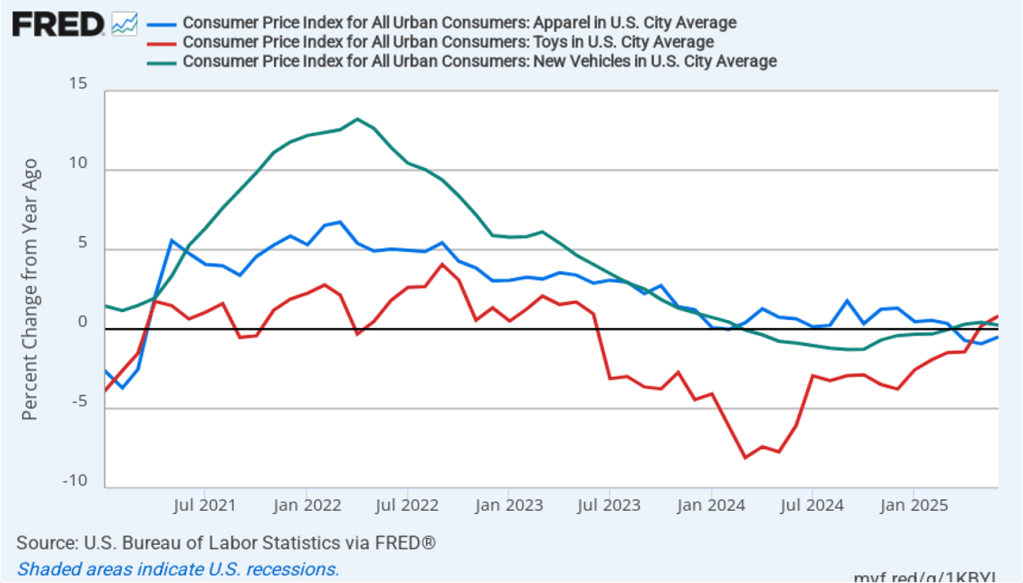Does the increase in inflation represent the effects of the increases in tariffs that the Trump administration announced on April 2? (Note that some of the tariff increases announced on April 2 have since been reduced) The following figure shows 12-month inflation in three categories of products whose prices are thought to be particularly vulnerable to the effects of tariffs: apparel (the blue line), toys (the red line), and motor vehicles (the green line). To make recent changes clearer, we look only at the months since January 2021. In June, prices of apparel fell, while the prices of toys and motor vehicles rose by less than 1.0 percent.