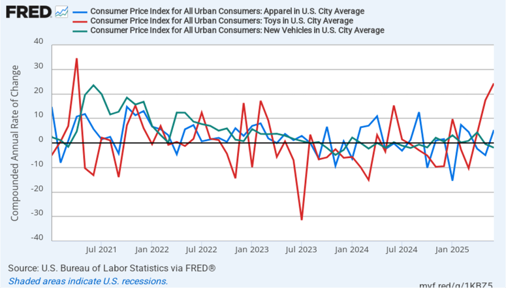 The following figure shows 1-month inflation in these prices of these products. In June, the motor vehicles prices fell, while apparel prices increased 5.3 percent and the prices of toys soared by 24.3 percent, which was the second month in a row of very large increases in toy prices.