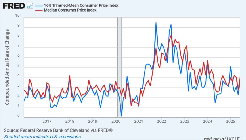The following figure shows that 12-month trimmed-mean inflation (the blue line) was 3.2 percent in June, up from 3.0 percent in May. Twelve-month median inflation (the red line) 3.6 percent in June, up from 3.5 percent in May.
