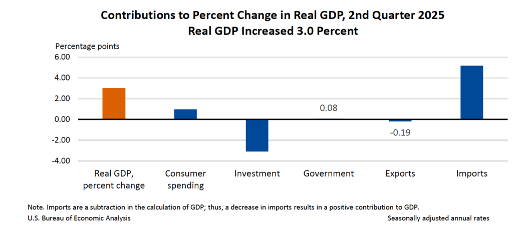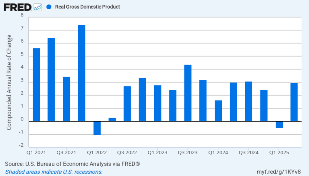 This morning (July 30), the Bureau of Economic Analysis (BEA) released its advance estimate of real GDP for the first quarter of 2025. (The report can be found here.) The BEA estimates that real GDP increased by 3.0 percent, measured at an annual rate, in the second quarter—April through June. Economists surveyed had expected a 2.4 percent increase. Real GDP declined by an estimated 0.5 percent in the first quarter of 2025, so the increase in the second quarter represents a strong rebound in economic growth. The following figure shows the estimated rates of GDP growth in each quarter beginning with the first quarter of 2021.