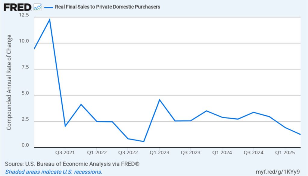 It’s notable that real private inventories declined by $29.6 billion in the second quarter after having increased by $2070 billion in the first quarter. Again, it’s likely that the large swings in inventories represented firms stockpiling goods in the first quarter in anticipation of the tariff increases and then drawing down those stockpiles in the second quarter.