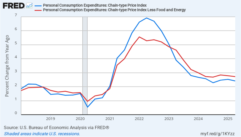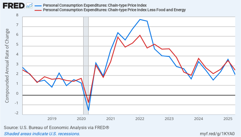 The following figure shows quarterly PCE inflation and quarterly core PCE inflation calculated by compounding the current quarter’s rate over an entire year. Measured this way, headline PCE inflation decreased from 3.7 percent in the first quarter of 2025 to 2.1 percent in the second quarter. Core PCE inflation decreased from 3.5 percent in the first quarter of 2025 to 2.5 percent in the secondt quarter. Measured this way, headline PCE inflation in the second quarter was close to the Fed’s target, while core PCE was well above the target. As we discuss in this blog post, tariff increases result in an aggregate supply shock to the economy. As a result, we may see a significant increase in inflation in the coming months as the higher tariff rates that have been negotiated recently begin to be implemented.
