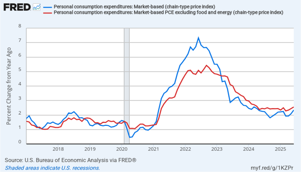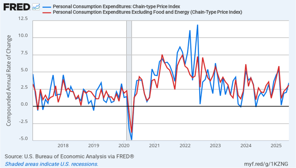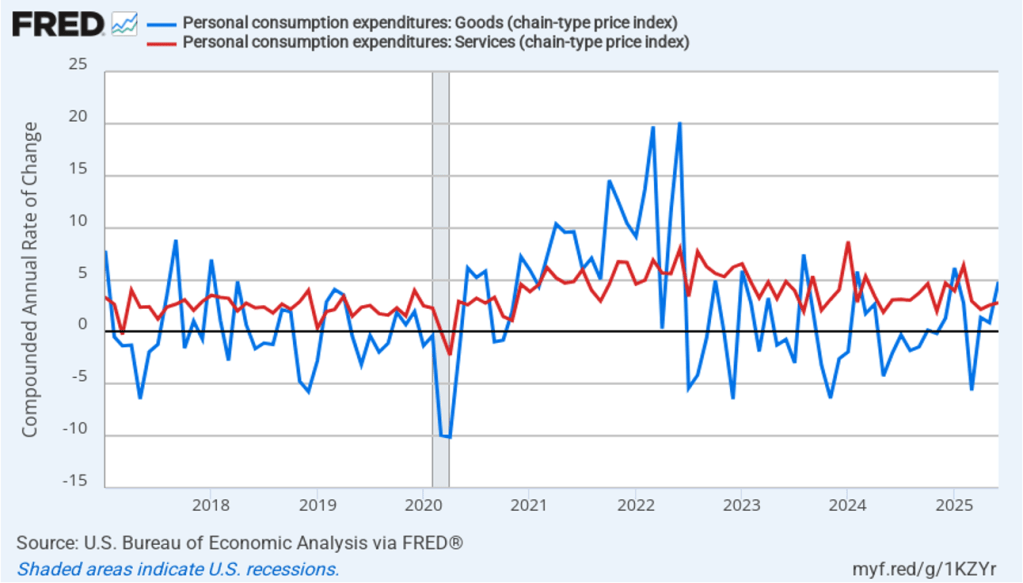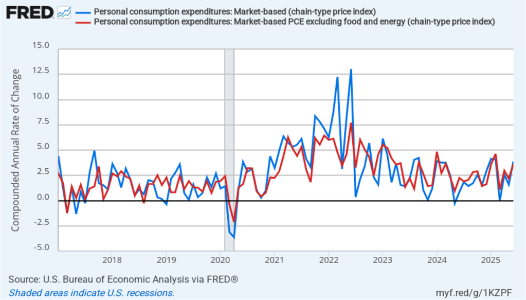 The following figure shows headline PCE inflation and core PCE inflation calculated by compounding the current month’s rate over an entire year. (The figure above shows what is sometimes called 12-month inflation, while this figure shows 1-month inflation.) Measured this way, headline PCE inflation jumped from 2.0 percent in May to 3.4 percent in June. Core PCE inflation increased from 2.6 percent in May to 3.1 percent in June. So, both 1-month PCE inflation estimates are well above the Fed’s 2 percent target. The usual caution applies that 1-month inflation figures are volatile (as can be seen in the figure), so we shouldn’t attempt to draw wider conclusions from one month’s data. In addition, these data likely don’t capture fully the higher prices likely to result from the tariff increases the Trump administration has implemented, including those in trade agreements that have only been announced in the past few days.