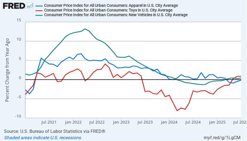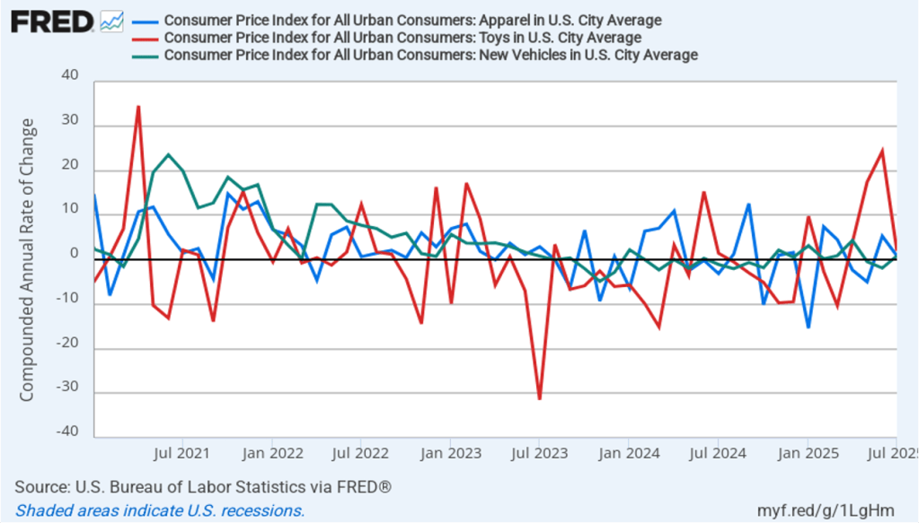 The following figure shows 1-month inflation in these prices of these products. In July, motor vehicles prices and apparel prices increased by less than 1 percent, while toy prices increased by 1.9 percent after having soared soared by 24.3 percent in June. At least for these three products, it’s difficult to see tariffs as having had a significant effect on inflation in July.