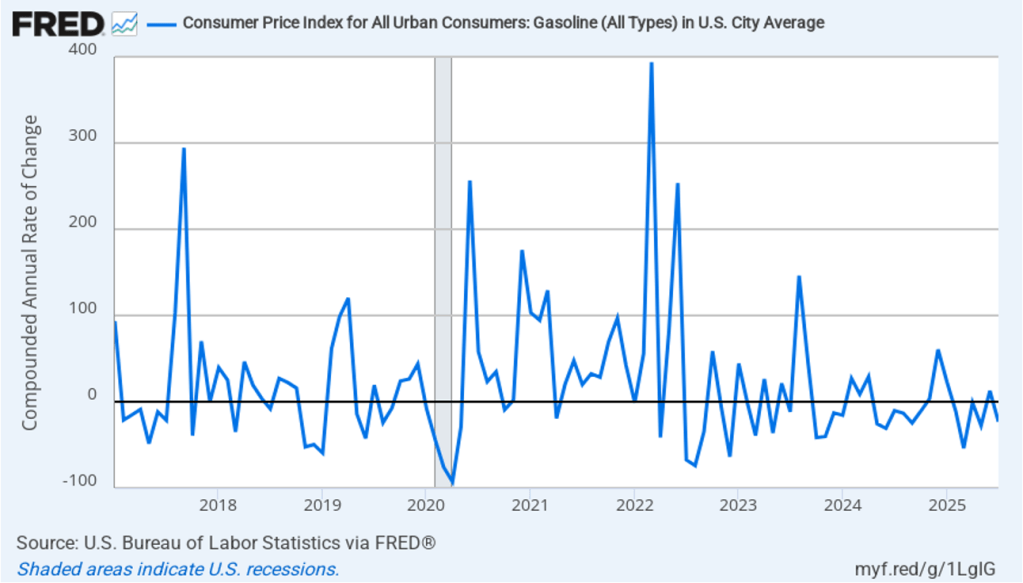 A key reason for core inflation being significantly higher than headline inflation is that gasoline prices declined by 23.1 percent at an annual rate in June. As shown in the following figure, 1-month inflation in gasoline prices moves erratically—which is the main reason that gasoline prices aren’t included in core inflation.