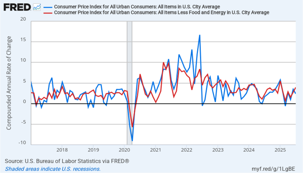 Today (August 12), the Bureau of Labor Statistics (BLS) released its report on the consumer price index (CPI) for July. The following figure compares headline CPI inflation (the blue line) and core CPI inflation (the red line).