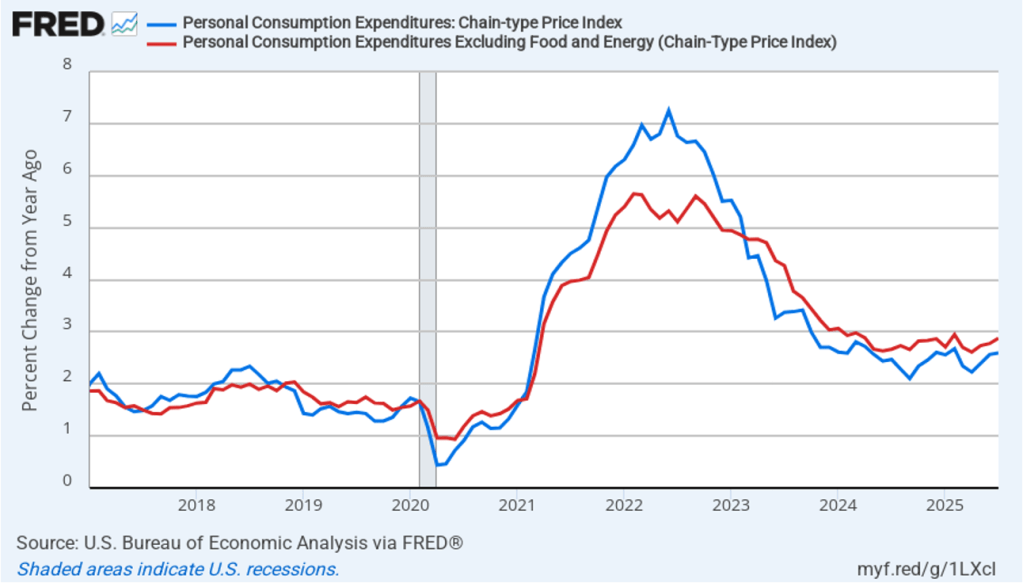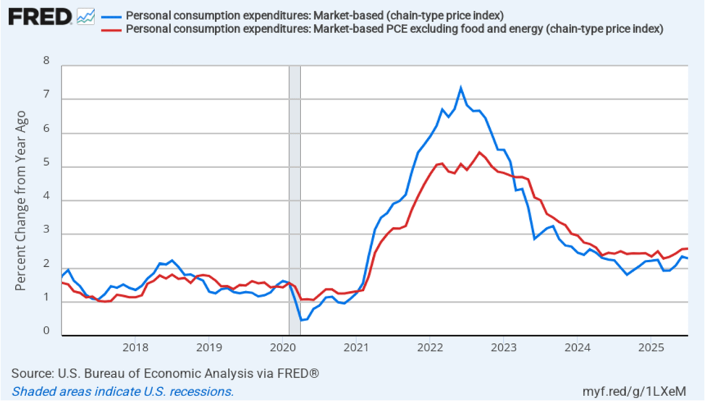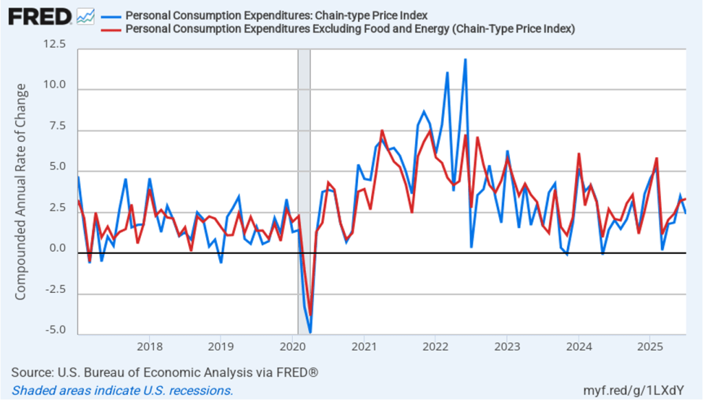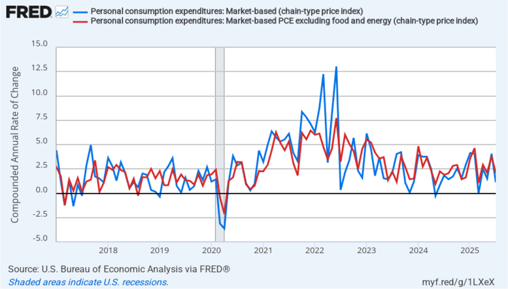 The following figure shows headline PCE inflation and core PCE inflation calculated by compounding the current month’s rate over an entire year. (The figure above shows what is sometimes called 12-month inflation, while this figure shows 1-month inflation.) Measured this way, headline PCE inflation fell from 3.5 percent in June to 2.4 percent in July. Core PCE inflation increased slightly from 3.2 percent in June to 3.3 percent in July. So, both 1-month PCE inflation estimates are above the Fed’s 2 percent target, with 1-month core PCE inflation being well above target. The usual caution applies that 1-month inflation figures are volatile (as can be seen in the figure), so we shouldn’t attempt to draw wider conclusions from one month’s data. In addition, these data may reflect higher prices resulting from the tariff increases the Trump administration has implemented. Once the one-time price increases from tariffs have worked through the economy, inflation may decline. It’s not clear, however, how long that may take and it’s likely that not all the effects of the tariff increases on the price level are reflected in this month’s data.