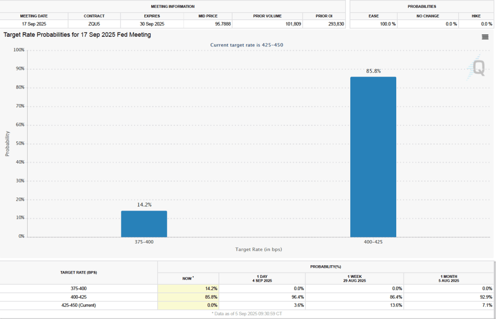 What effect might today’s jobs report have on the decisions of the Federal Reserve’s policymaking Federal Open Market Committee (FOMC) with respect to setting its target for the federal funds rate? One indication of expectations of future changes in the FOMC’s target for the federal funds rate comes from investors who buy and sell federal funds futures contracts. (We discuss the futures market for federal funds in this blog post.) As we’ve noted in earlier blog posts, since the weak July jobs report, investors have assigned a very high probability to the committee cutting its target by 0.25 percentage point (25 basis points) from its current range of 4.25 percent to 4.50 percent at its September 16–17 meeting. This morning, as the following figure shows, investors raised the probability they assign to a 50 basis point reduction at the September meeting from 0 percent to 14.2 percent. Investors are also now assigning a 78.4 percent probability to the committee cutting its target range by at least an additional 25 basis points at its October 28–29 meeting.