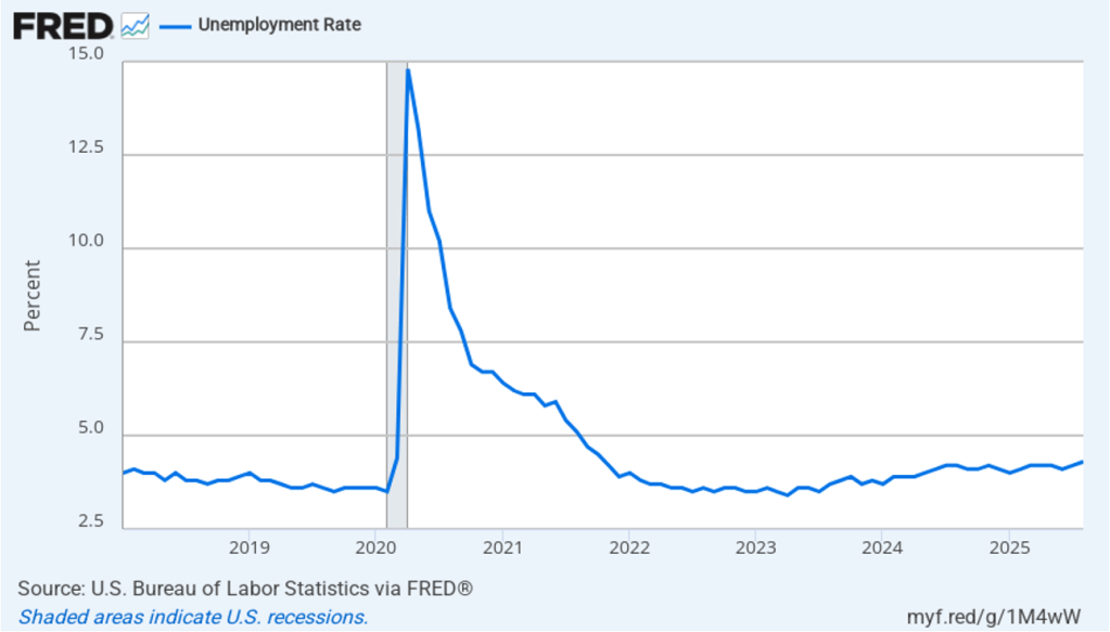 The unemployment rate increased from 4.2 percent in July to 4.3 percent in August, the highest rate since October 2021. The unemployment rate is above the 4.2 percent rate economists surveyed by FactSet had forecast. As the following figure shows, the unemployment rate had been remarkably stable over the past year, staying between 4.0 percent and 4.2 percent in each month May 2024 to July 2025 before breaking out of that range in August. In June, the members of the Federal Open Market Committee (FOMC) forecast that the unemployment rate during the fourth quarter of 2025 would average 4.5 percent. The unemployment rate would still have to rise significantly for that forecast to be accurate.