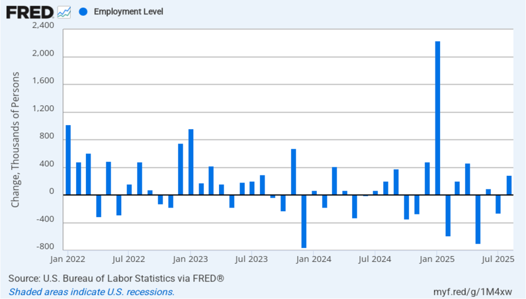 The following figure from the jobs report shows the net change in nonfarm payroll employment for each month in the last two years. The figure makes clear the striking deceleration in job growth since April. The Trump administration announced sharp increases in U.S. tariffs on April 2. Media reports indicate that some firms have slowed hiring due to the effects of the tariffs or in anticipation of those effects.