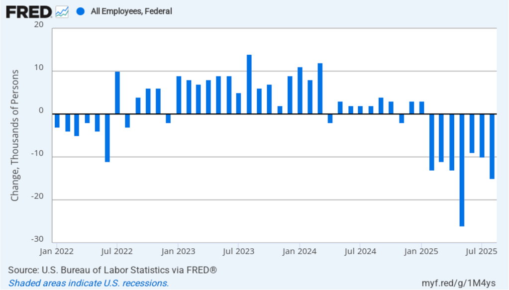 It is still unclear how many federal workers have been laid off since the Trump Administration took office. The establishment survey shows a decline in federal government employment of 15,000 in August and a total decline of 97,000 since the beginning of February 2025. However, the BLS notes that: “Employees on paid leave or receiving ongoing severance pay are counted as employed in the establishment survey.” It’s possible that as more federal employees end their period of receiving severance pay, future jobs reports may report a larger decline in federal employment. To this point, the decline in federal employment has had a small effect on the overall labor market.
