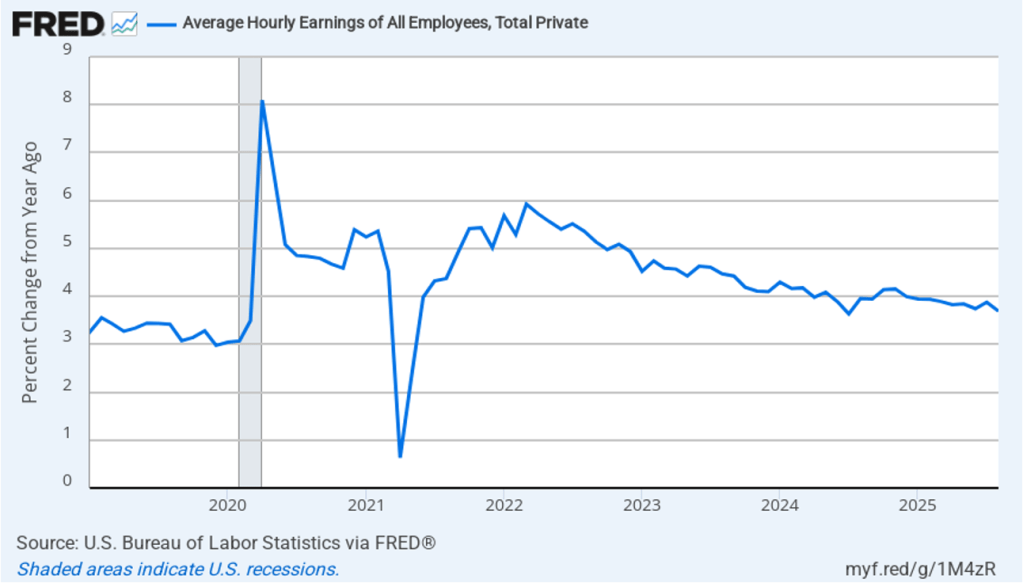 The household survey has another important labor market indicator: the employment-population ratio for prime age workers—those aged 25 to 54. In August the ratio rose to 80.7 percent from 8.4 percent in July. The prime-age employment-population ratio is somewhat below the high of 80.9 percent in mid-2024, but is still above what the ratio was in any month during the period from January 2008 to February 2020. The increase in the prime-age employment-population ratio is a bright spot in this month’s jobs report.
