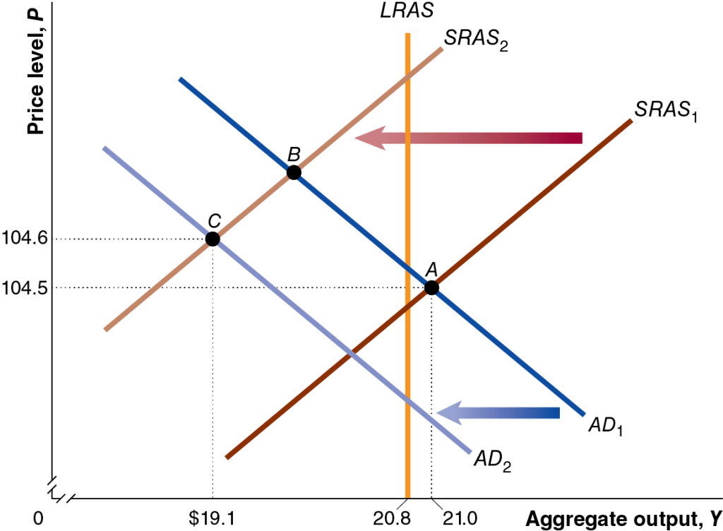 But when the Fed faces an aggregate supply shock, its preferred policy response is unclear. An aggregate supply shock, such as the U.S. economy experienced during the Covid pandemic and again with the tariff increases that the Trump administration began implementing in April, will shift the short-run aggregate supply curve (SRAS) will shift to the left, causing an increase in the price level, along with a decline in real GDP and employment. This combination of rising unemployment and inflation is called stagflation. In this situation, the FOMC faces a policy dilemma: Raising the target for the federal funds rate will help reduce inflation, but will likely increase unemployment, while lowering the target for the federal funds rate will lead to lower unemployment, but will likely increase inflation. The following figure shows the situation during the Covid pandemic when the economy experienced both an aggregate demand and aggregate supply shock. The aggregate demand curve and the aggregate supply curve both shifted to the left, resulting in falling real GDP (and employment) and a rising price level.