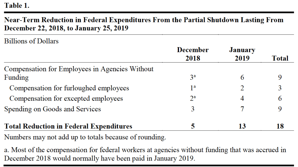 Table 1 from the CBO report shows the effect of the shutdown on federal government expenditures. (Note that the CBO refers to the shutdown as being “partial” because, as in all federal government shutdowns, essential government services continued to be provided.)