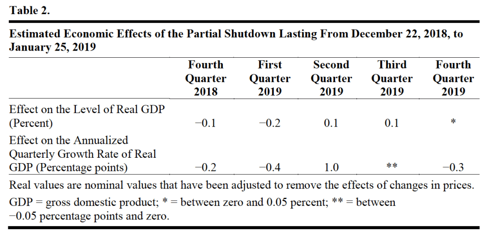 Table 2 from the report shows the effects of the shutdown on real GDP.