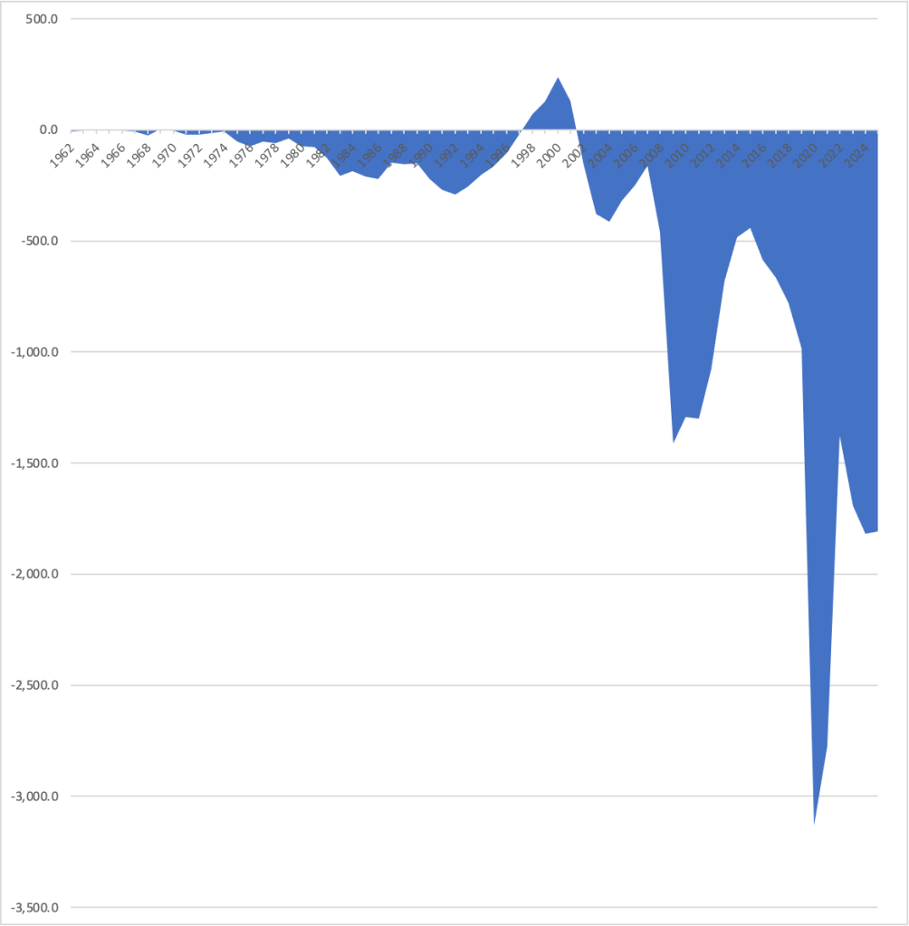 The federal government’s fiscal year runs from October 1 to September 30. Today (October 8), the Congressional Budget Office (CBO) released its estimate of the deficit for the fiscal year ending September 30, 2025. The deficit fell slightly from $1,817 billion in 2024 to $1,809 in 2025. As the following figure shows, the budget deficit in 2025 remains very large, particularly at a time when the U.S. economy is at or very close to full employment, although well below the record deficit of $3,133 billion in 2020.