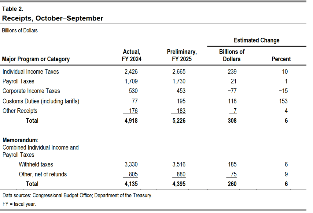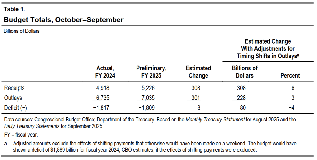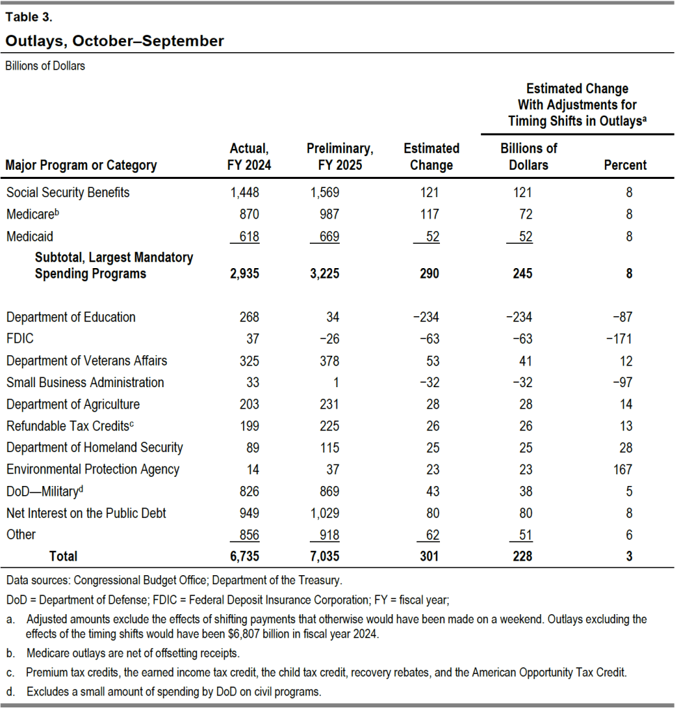 The following table from the CBO report shows that in 2025 federal receipts increased slightly more than federal outlays, leading to a slightly smaller deficit.