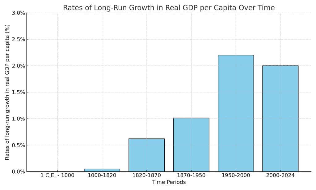 This year’s three Nobelists have contributed to understanding why economic growth accelerated sharply in the nineteenth century and why England was the first country to experienced sustained increases in real GDP per capita—an event labeled the Industrial Revolution. Joel Mokyr of Northwestern University has conducted decades of research into which innovations were crucial to economic growth and the institutional and economic advantages that allowed entrepreneurs in England to use those innovations to expand production much more rapidly than had happened before. Philippe Aghion of Collège de France and INSEAD and Peter Howitt of Brown University have focused on formally modeling the process of creative destruction that underlies sustained economic growth. The classic discussion of creative destruction appears in Joseph Schumpeter’s book Capitalism, Socialism, and Democracy, published in 1942.