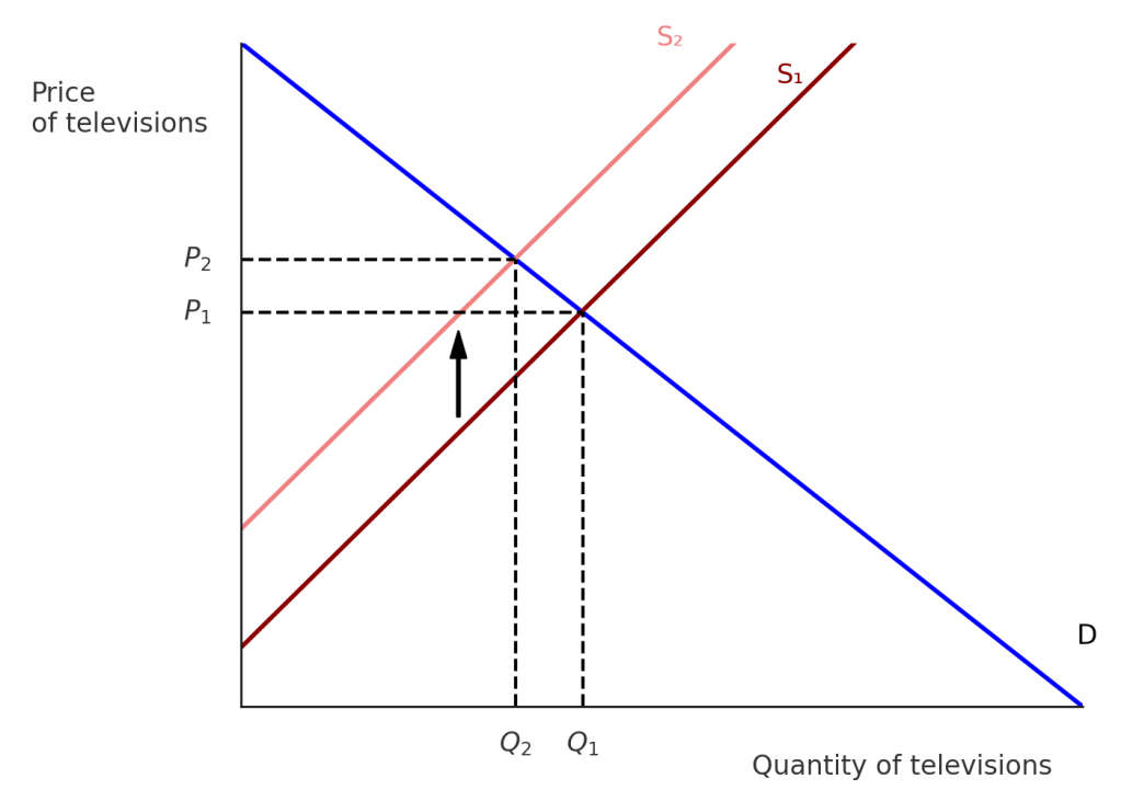 - Use a demand and supply graph to illustrate the effect of an increased tariff on imported televisions on the market for televisions in the United States. Be sure that your graph shows any shifts of the curves and the equilibrium price and quantity of televisions before and after the tariff increase.
