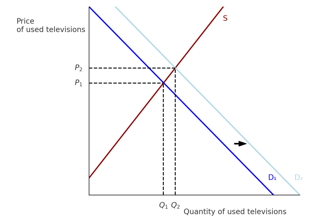 Step 2: Answer part b. by drawing a demand and supply graph of the market for used televisions in the United States that illustrates the effect on that market of an increased tariff on imports of new televisions. Although the tariff on imported televisions doesn’t directly affect the market for used televisions, it does so indirectly. As the article from the Wall Street Journal notes, “Today, in the tariff era, demand for used goods is surging.” Because used televisions are substitutes for new televisions, we would expect that an increase in the price of new televisions would cause the demand curve for used televisions to shift to the right, as shown in the following figure. The result will be that the equilibrium price of used televisions will increase from P1 to P2, while the equilibrium quantity of used televisions will increase from Q1 to Q2.