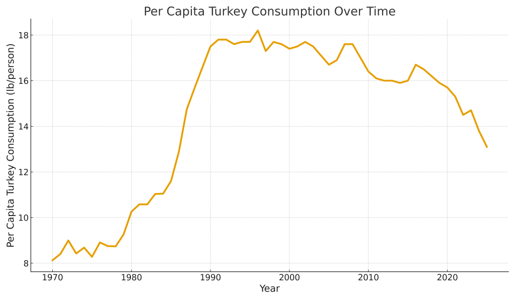 Turkey consumption peaked at 18.2 pounds per person in 1996 and has fallen to an estimated 13.1 pounds per person in 2025—a decline of about 28 percent. Is this decline an indication that people have moved away from eating turkey for Thanksgiving? Fox argues that it likely doesn’t. Note the rapid rise of turkey consumption between 1980 and 1990. Fox believes the surge in consumption was due to “both chicken and turkey [consumption increasing] as health concerns led many Americans to shun red meat starting in the late 1970s ….” In recent years, though, “red-meat consumption has steadied … chicken consumption has continued to rise, and turkey is losing out. Maybe people just don’t like how it tastes.” Glenn and Tony agree that, alas, turkey is often dry—although, admittedly, skilled cooks claim that it isn’t dry when prepared properly.