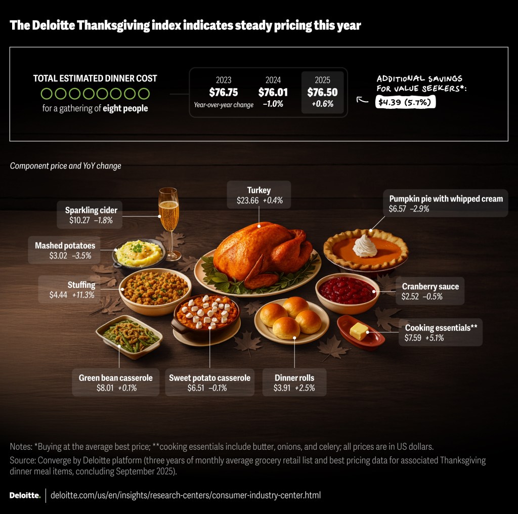The following image shows the food that they include in their cost calculation. For that particular Thanksgiving dinner, the cost is slightly higher than in 2024, although slightly lower than in 2023.