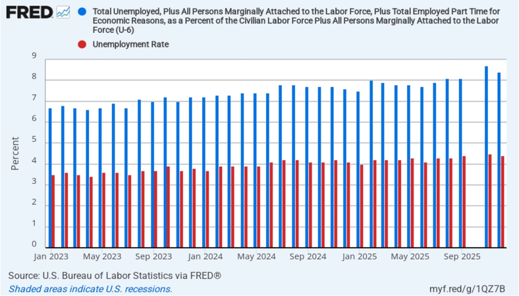 The following figure shows the U-6 measure of the unemployment rate (the blue bars). This measure differs from the more familiar (U-3) measure of the unemployment rate (the red bars) in that it includes people who are working part time for economic reasons and people who are marginally attached to the labor force. The BLS counts people as marginally attached to the labor force if they “indicate that they have searched for work during the prior 12 months (or since their last job if it ended within the last 12 months), but not in the most recent 4 weeks. Because they did not actively search for work in the last 4 weeks, they are not classified as unemployed [according to the U-3 measure].” Between June 2025 and December 2025, the U-3 meaure of unemployment increased by 0.3 percentage point, while the U-6 measure increased by 0.7 percentage point.