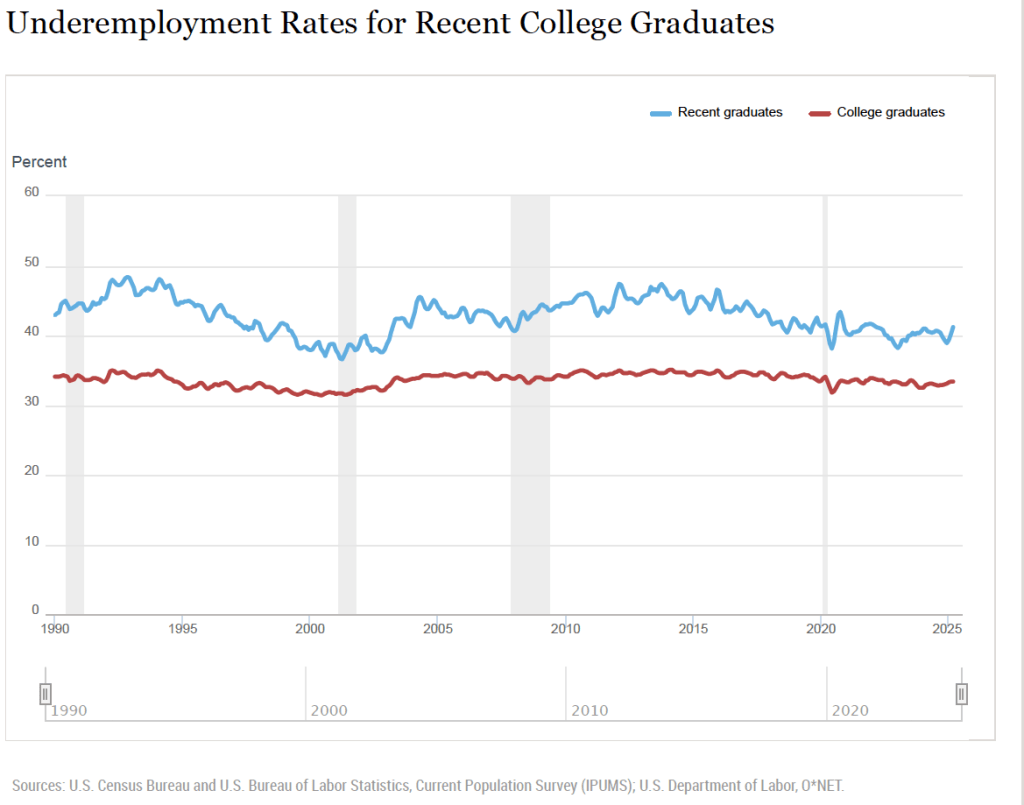 A number of news stories have highlighted the struggles some recent college graduates have had in finding a job. A report earlier this year by economists Jaison Abel and Richard Deitz at the Federal Reserve Bank of New York noted that: “The labor market for recent college graduates deteriorated noticeably in the first quarter of 2025. The unemployment rate jumped to 5.8 percent—the highest reading since 2021—and the underemployment rate rose sharply to 41.2 percent.”  The authors define “underemployment” as “A college graduate working in a job that typically does not require a college degree is considered underemployed.”