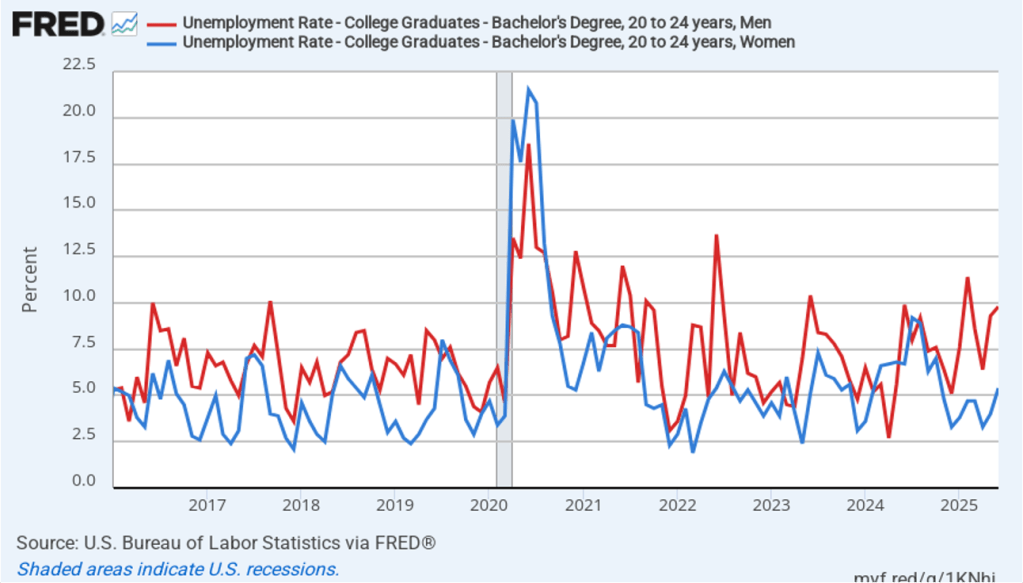 In a recent article, John Burn-Murdoch, a data journalist for the Financial Times, has made the point that the high unemployment rates of recent college graduates are concentrated among males. As the following figure shows, in recent months, unemployment rates among male college graduates 20 to 24 years old have been significantly higher than the unemployment rates among female college graduates. In June 2025, the unemployment rate for male recent college graduates was 9.8 percent, well above the 5.4 percent unemployment for female recent college graduates.