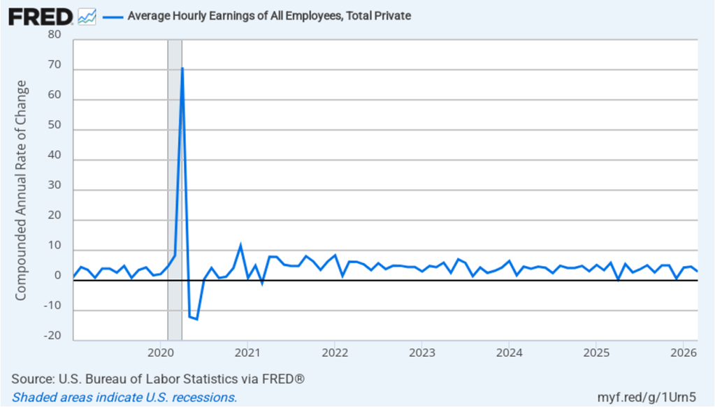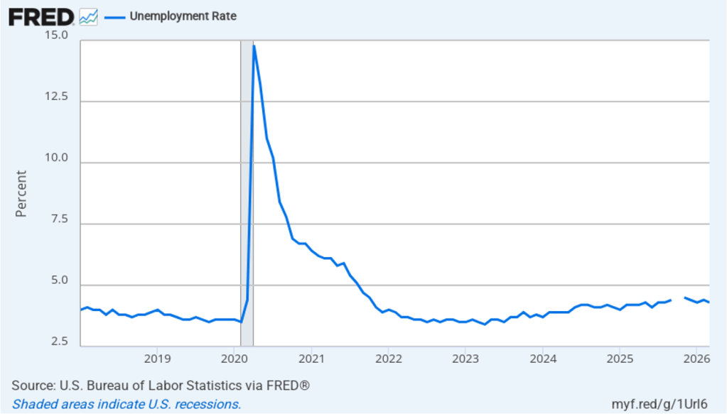 These fluctuations of net employment gains around zero are consistent with a recent analysis from economists at the Federal Reserve Bank of Dallas that estimates the break-even rate of employment growth—the rate of employment growth at which the unemployment rate remains constant. They note that “continued net outflows of unauthorized immigrants, together with shifts in labor force participation, have pushed the monthly break-even employment growth lower than previously thought.” They conclude that: “The break-even rate [of employment growth] peaked at about 250,000 jobs per month in 2023, fell to roughly 10,000 by July 2025, and declined to near zero thereafter, averaging about –3,000 jobs per month from August to December 2025, indicating, if anything, a modest net jobs loss over this period.” In other words, in the current labor market, the break-even rate of employment growth may actually be negative.