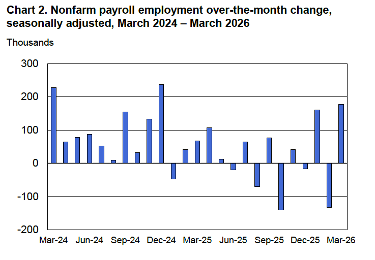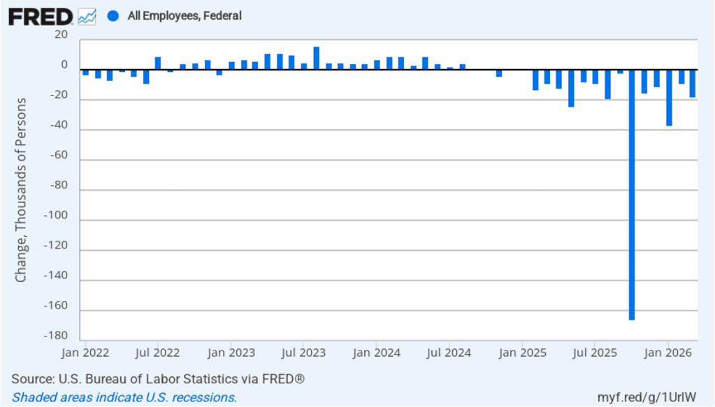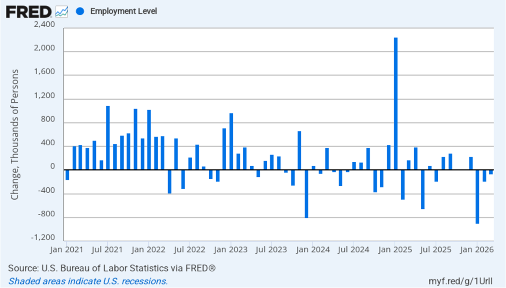 The following figure from the jobs report shows the net change in nonfarm payroll employment for each month in the last two years. The figure shows an unusual pattern in the job market since the middle of 2025 in which months of declining employment and months of increasing employment alternate.