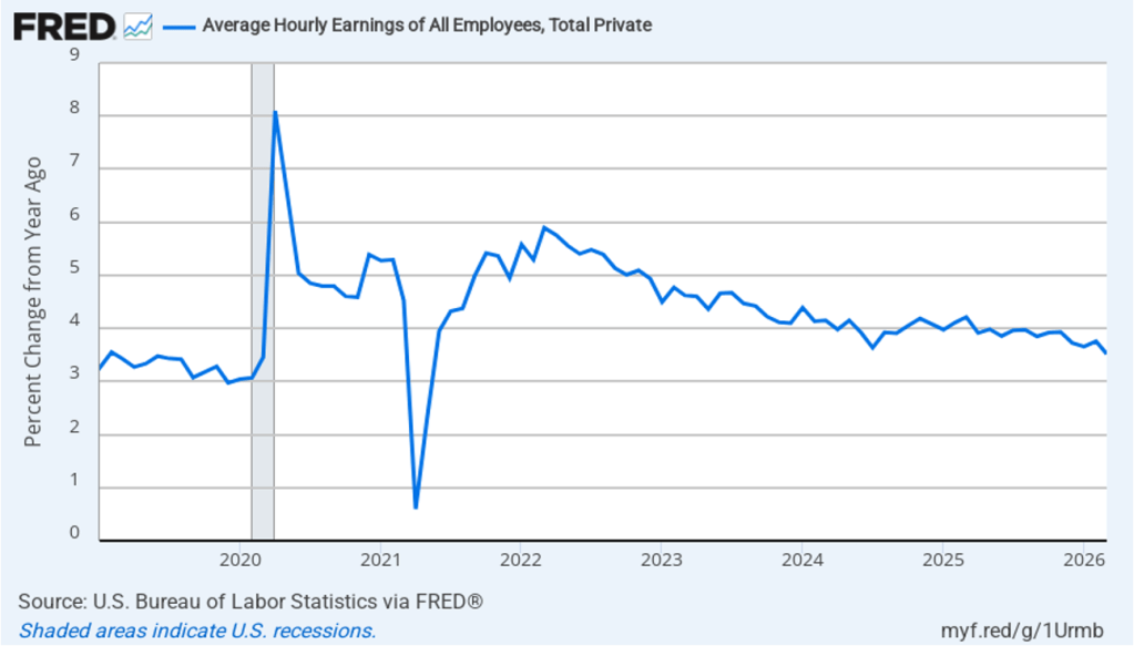 The Trump Administration’s layoffs of some federal government workers are clearly shown in the estimate of total federal employment for October, when many federal government employees exhausted their severance pay. (The BLS notes that: “Employees on paid leave or receiving ongoing severance pay are counted as employed in the establishment survey.”) As the following figure shows, there was a decline in federal government employment of 166,000 in October, with additional declines in the following five months. The total decline in federal government employment since the beginning of February 2025 is 352,000. But the decline has been slowing, with a net decrease of 18,000 jobs in March. So, the effect of layoffs of federal government workers is no longer a major factor in month-to-month changes in total employment.