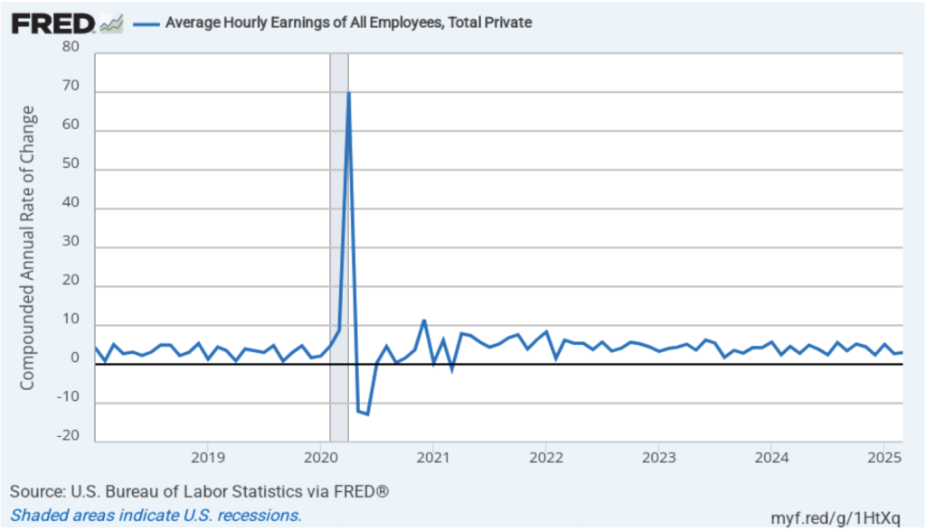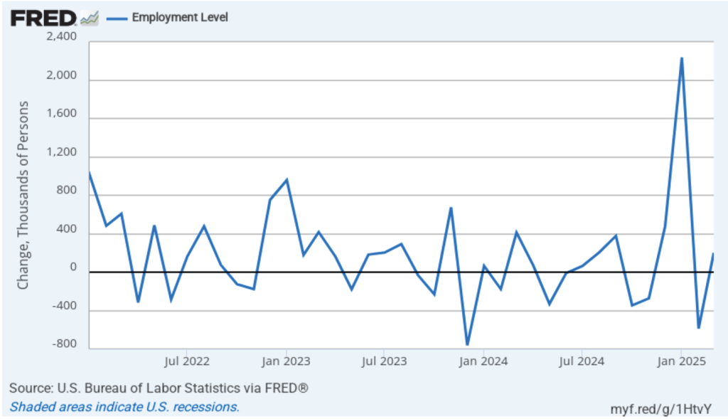 As we’ve noted in earlier posts, according to the usually reliable GDPNow forecast from the Federal Reserve Bank of Atlanta, real GDP in the first quarter of 2025 will decline by 2.8 percent. This morning (April 4), the Bureau of Labor Statistics (BLS) released its “Employment Situation” report (often called the “jobs report”) for March. The data in the report show no sign that the U.S. economy is in a recession. We should add two caveats, however: 1. The effects of the unexpectedly large tariff increases announced this week by the Trump Administration are not reflected in the data from this report, and 2. at the beginning of a recession the data in the jobs report can be subject to large revisions.
