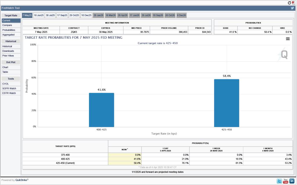 One indication of expectations of future cuts in the target for the federal funds rate comes from investors who buy and sell federal funds futures contracts. (We discuss the futures market for federal funds in this blog post.) The data from the futures market indicate that, despite the potential effects of the surprisingly large tariff increases, investors don’t expect that the FOMC will cut its target for the federal funds rate at its May 6–7 meeting. As shown in the following figure, investors assign a 58.4 percent probability to the committee keeping its target unchanged at 4.25 percent to 4.50 percent at that meeting.