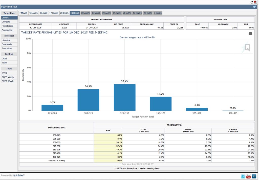 It’s a different story if we look at the end of the year. As the following figure shows, investors now expect that by the end of the FOMC’s meeting on December 9-10, the committee will have implemented at least four 0.25 percentage point (25 basis points) cuts in its target range for the federal funds rate. Investors assign a probability of 75.8 percent that the target range will end the year 3.25 percent to 3.50 percent or lower. At their March meeting, FOMC members projected only two 25 basis point cuts this year—but that was before the announcement of the unexpectedly large tariff increases.
